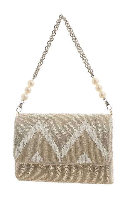 Embroidered zigzag cut dana embellishments, Chain link strap with pearl accents, Magnetic lock closure