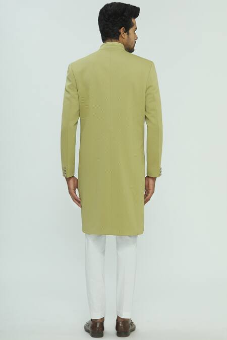 Mint green textured straight sherwani with welt pocket. Comes with white trousers.