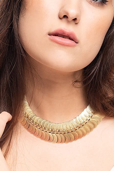 Gold necklace featuring dual layers of embossed coin embellishments