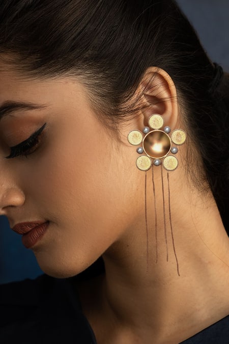 Embossed coin detailing around the studs, Stone embellishments for added sparkle, Hanging chains for a dramatic effect