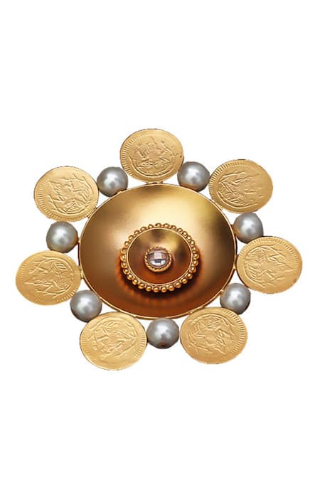 22kt gold plated hair brooch featuring kasu coins in a floral pattern, adorned with chandra and crystals