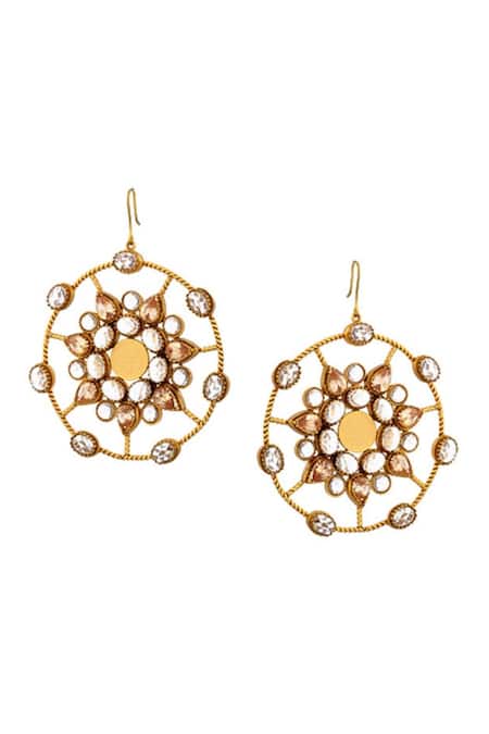Gold dangler earrings featuring a kaleidoscope spiderweb design embellished with crystals