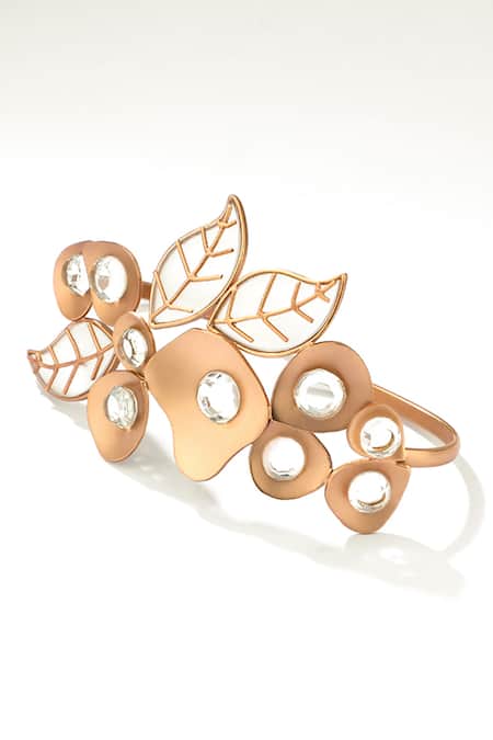 Gold cuff bracelet featuring a floral leaf pattern embellished with crystals