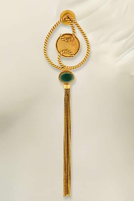 Gold earrings featuring a shield coin motif embellished with green crystals and multiple chains