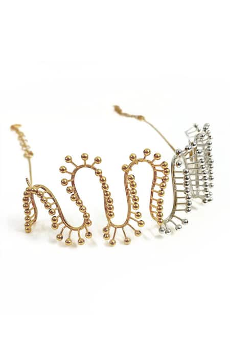 Two-tone fringe wave pattern choker featuring a blend of 22kt gold and 92.5 silver plating. Handcrafted with dimensions of 35 cm in length and 4 cm in height, secured with a lobster hook closure.