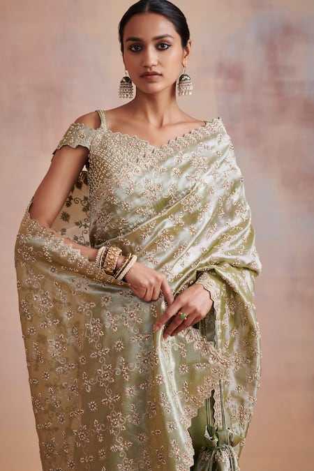 Moss green hand embroidered saree in aari work. Paired with embroidered cold shoulder choli and petticoat.