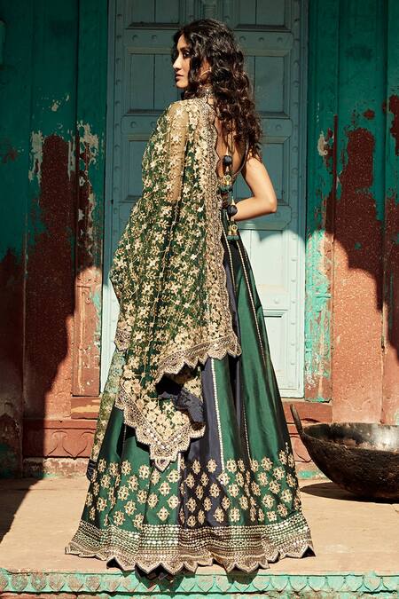 Blue, green silk lehenga with aari and mirror work embroidery. Paired with a green blouse and embroidered net dupatta with cutwork hem.