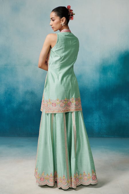 Aqua kurta featuring floral leaf resham, gota and mirror embroidery. Paired with an embroidered gharara and organza dupatta, showcasing intricate detailing and tassel edges.