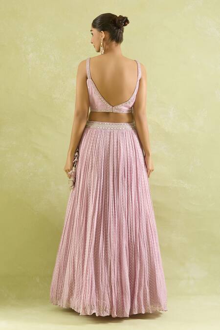 Purple lehenga featuring a gathered flare design with shimmery motif patterns. Paired with a matching embroidered blouse and a cutwork border cape adorned with leather, mirror, gota, and zari highlights.