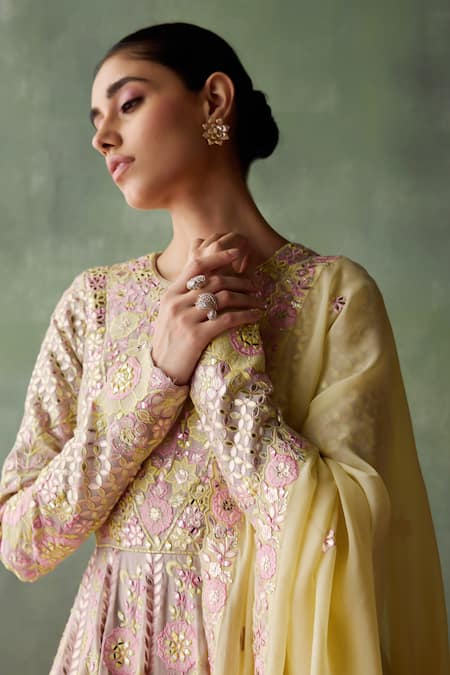 Intricate Jashn bahar embroidery, Gota, leather, and mirror highlights, Flared silhouette for a dramatic effect