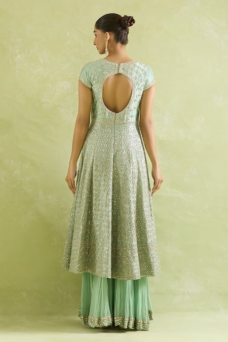 Aqua green Anarkali featuring cap sleeves and all-over mirror bloom jaal embroidery. Paired with an embroidered border sharara and a matching dupatta.