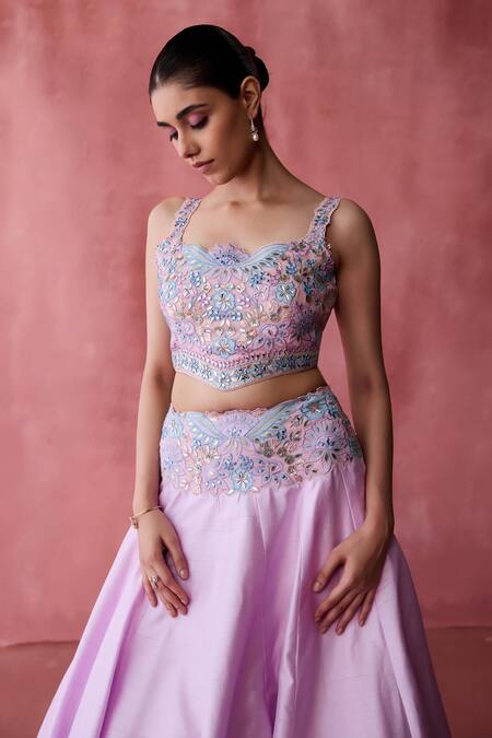 Pink lehenga set featuring a heavily embroidered corset style blouse with patchwork and mirror highlights. Accompanied by a long cape with cutwork borders and floral embroidery details.