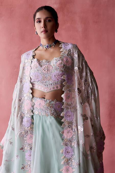 Blue lehenga set featuring a heavily embroidered corset style blouse and an attached cancan. Accompanied by a long cape with cutwork border and resham & mirror embroidery details.