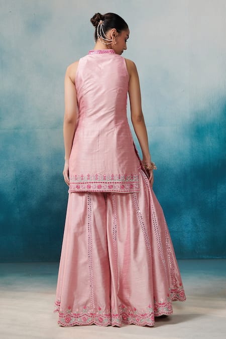 Pink Silk, Organza, Cotton Embroidery Collared Straight Kurta Gharara Set