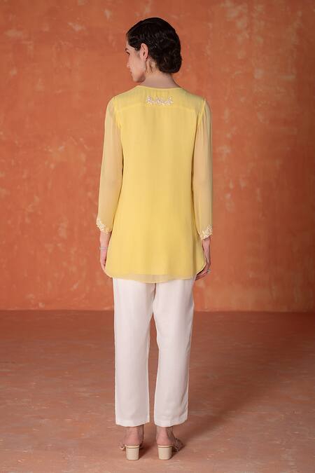 Yellow tunic made from georgette featuring intricate floral embroidery along the neckline and hem