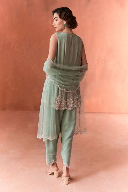 Green A-line kurta featuring intricate embroidery with a flowy silhouette. Paired with matching pant and net dupatta for a cohesive look.