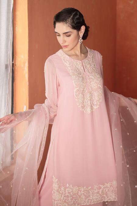 Pink georgette straight kurta featuring intricate embroidery. Paired with matching pant and organza dupatta.