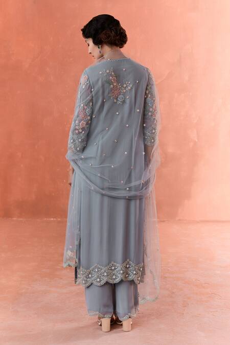Stone blue kurta featuring intricate cutdana embroidery and a straight silhouette. Paired with matching pants and a delicate net dupatta.