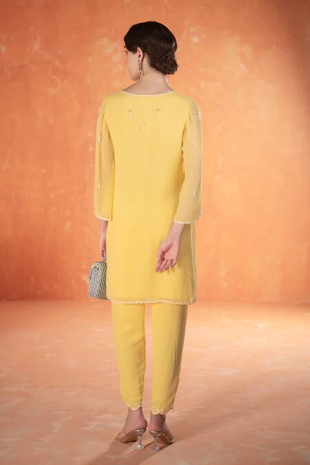 Yellow georgette kurta featuring a V-neckline and embellished details. Paired with matching yellow pants that have a stylish design.