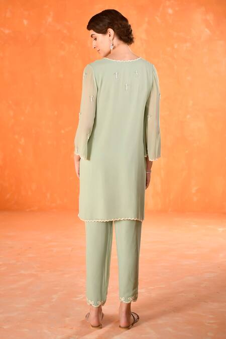Buy_Summer By Priyanka Gupta_Green Georgette Embroidery V-neck Bow Co-ord Set_Online_at_Aza_Fashions