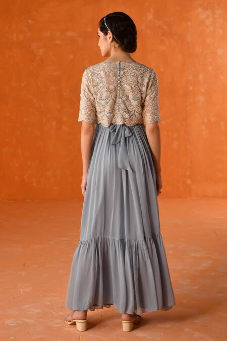 Stone blue dress in georgette featuring a flowy silhouette. Paired with a net overlay top adorned with intricate embellishments.