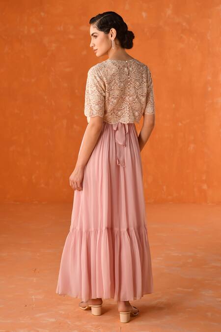 Pink dress made of georgette featuring a flowy silhouette. Accompanied by a net overlay top with intricate embellishments.