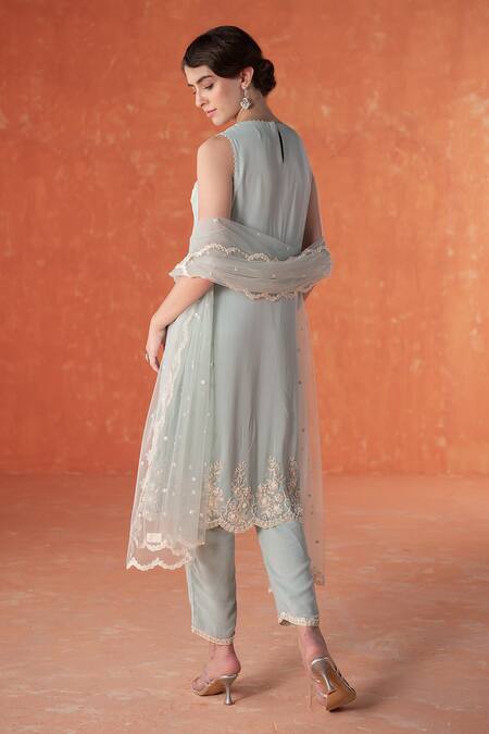 Citrus blue A-line long kurta featuring intricate embroidery. Paired with matching pants and a net dupatta with embellishments.