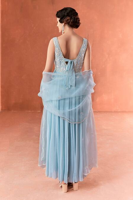 Citrus blue Anarkali featuring intricate mukaish embroidery and a back tie-up detail. Paired with a coordinating pant and organza dupatta.