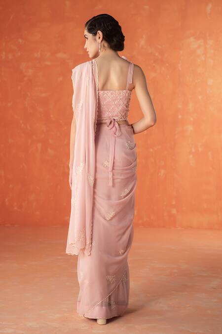 Pink chiffon saree featuring delicate embroidery and a matching georgette blouse. The set includes a stylish belt to complete the look.