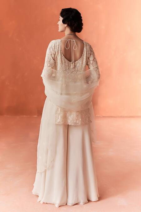 Ivory kurta made of organza featuring intricate embroidery. Paired with a georgette sharara and an organza dupatta.