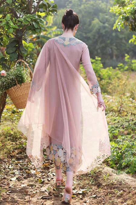 Pink georgette kurta featuring floral and dori cutwork embroidery with front button closure. Paired with matching pant and a dupatta.