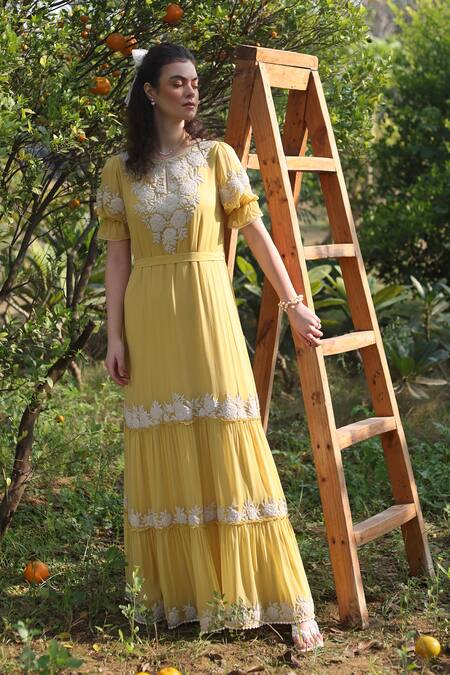 Buy_Summer By Priyanka Gupta_Yellow Georgette Embroidery Round Neck Gardenia Harvest Maxi Dress_at_Aza_Fashions