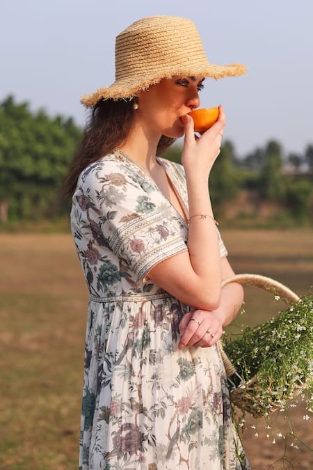 Ivory Georgette Embroidery V-neck Gardenia Printed Wrap-around Dress