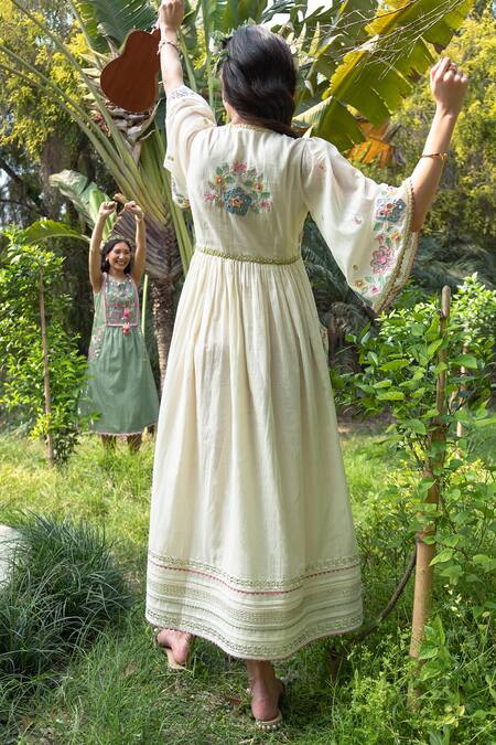 Ivory maxi dress featuring a V neck, flared sleeves, and embroidered fun pockets