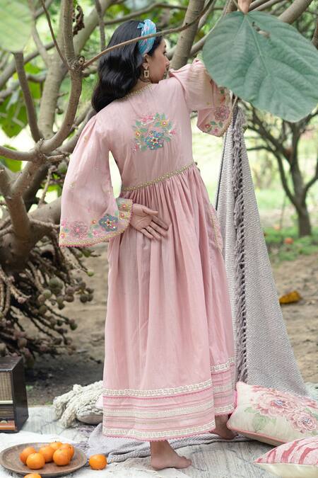 Pink Cotton, Lurex Embroidery, Mirrors V-neck Gypsy Floral Brocade And Work Dress
