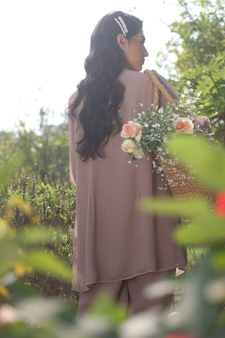 Fall pink georgette pleated kurta featuring floral and dori embroidery. Paired with matching pant.