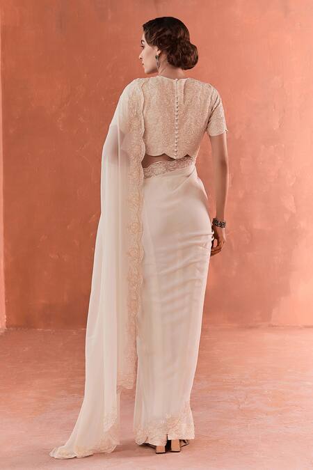 Ivory saree crafted from georgette featuring intricate lace detailing. Paired with a matching georgette blouse showcasing delicate embroidery.