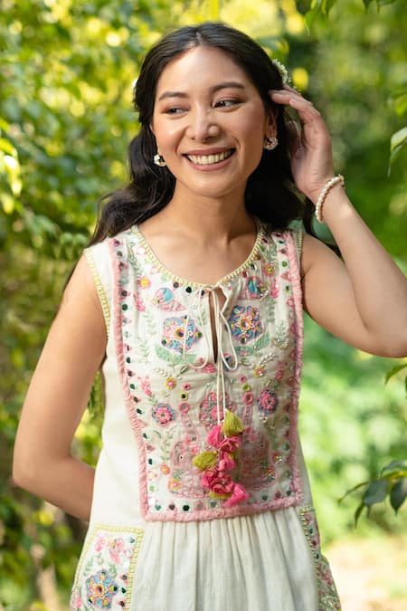 Colorful floral embroidery with mirror embellishments, Brocade detailing around the neckline and pockets, Pom-pom accents at the hemline