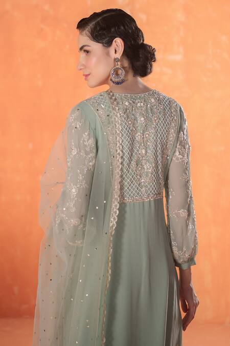 Cut work neckline, Embroidered back yoke, Sequinned scalloped cut work border details