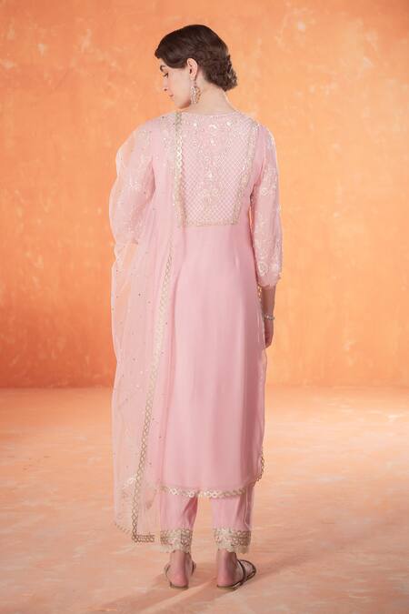 Pink georgette kurta featuring intricate embroidery and a V-neckline. Paired with matching pants and a net dupatta adorned with embellishments.