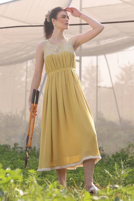 Buy_Summer By Priyanka Gupta_Yellow Georgette Embroidery Round Neck Loop Dress_at_Aza_Fashions