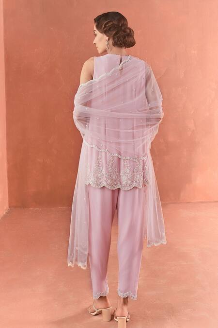 Pink georgette A-line kurta featuring intricate embroidery and a scalloped hem. Paired with matching pants and a net dupatta adorned with embellishments.