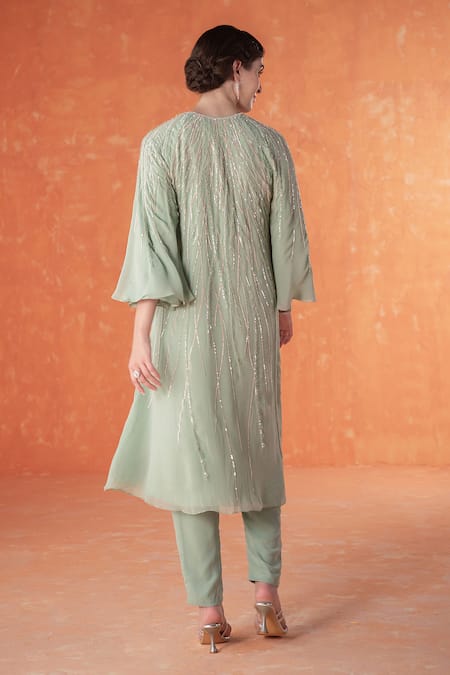 Green georgette kurta featuring intricate embellishments and a button closure. Paired with matching straight pants.