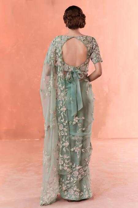 Green organza saree adorned with floral embroidery and a matching raw silk blouse. The blouse features a back tie detail and intricate embellishments.