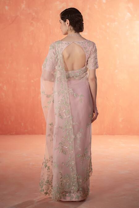 Pink organza saree embellished with dori work and sequins. Paired with a matching raw silk blouse featuring intricate embroidery.