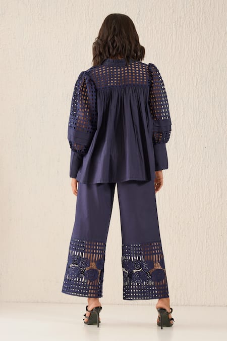 Blue Cotton Embroidery Openwork Culotte Trouser