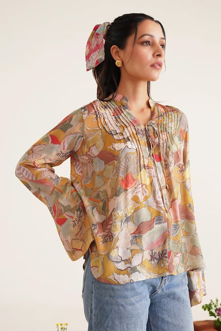 Multi Color Cotton Button-down Neck Floral Print Pintucked Top