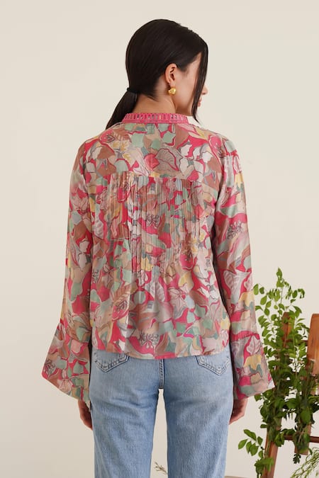 Pink Cotton Lace, Embroidery Button-down Neck Floral Print Top
