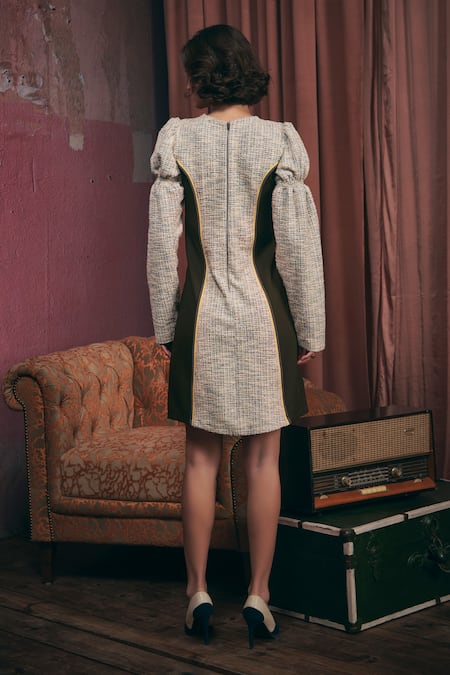 Gray Tweed Round Neck Grey Color Block Panelled Dress