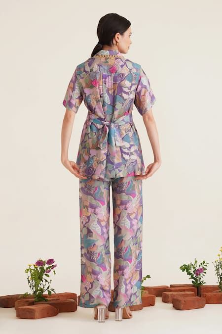 Purple floral printed shirt featuring a collared neckline, half sleeves, and a criss-cross waist belt. Paired with tailored pants that have a matching floral print and contrast lace detailing.